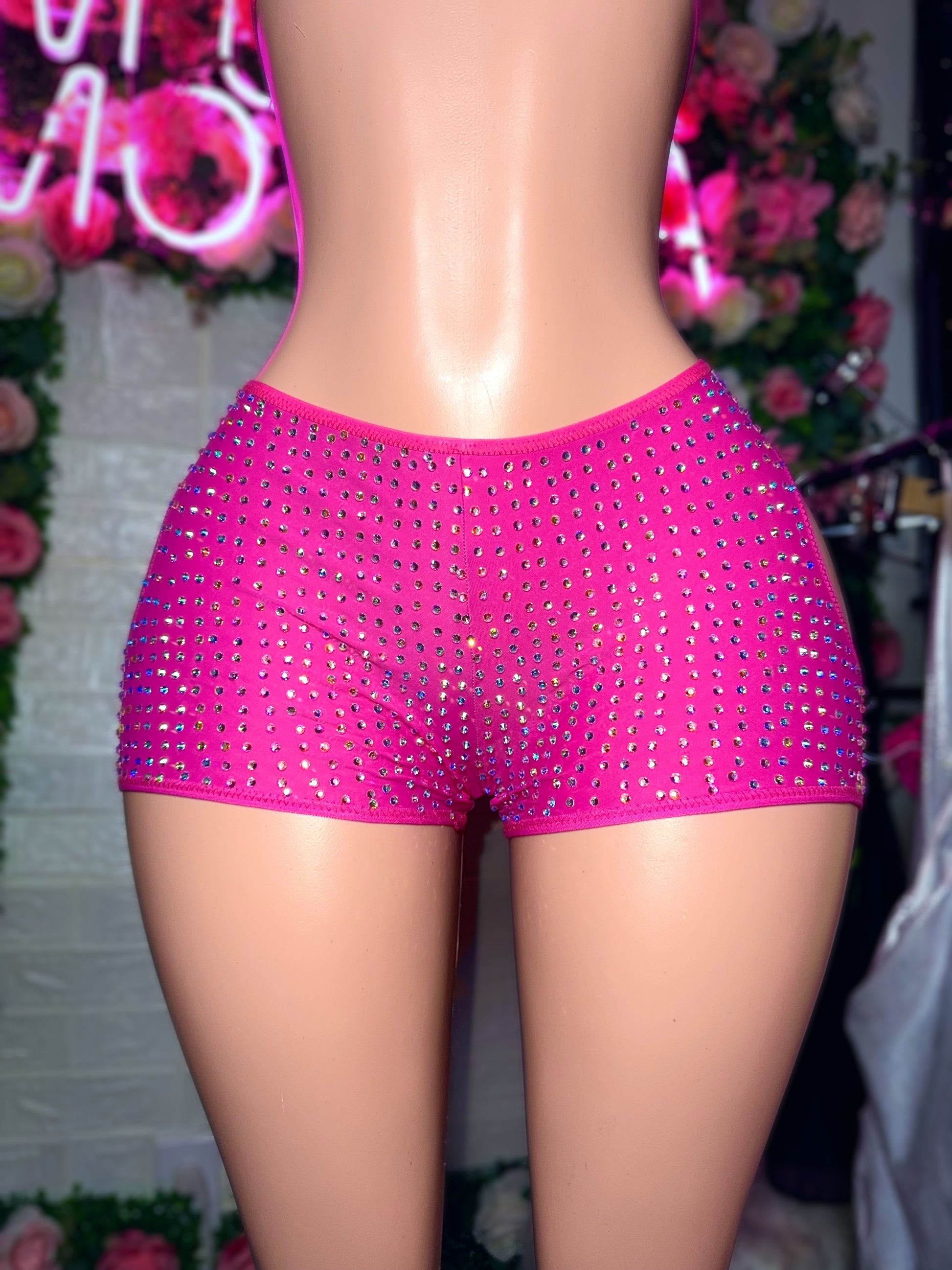 Be the center of attention with this rhinestone-covered stripper outfit. This two-piece set features cut out booty shorts with a triangle bikini top.