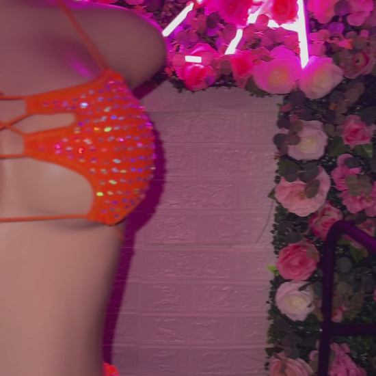Transform your look with this rhinestone-covered stripper outfit. This two-piece set features a sexy lace up top and high waist thong bottoms.