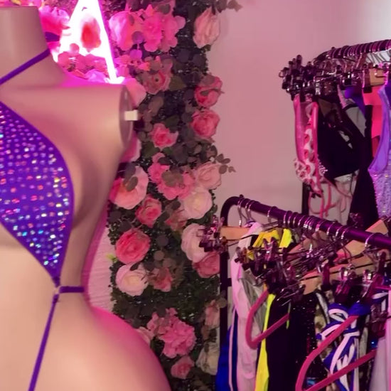 Stand out in this ultra-glam crystal set, perfect for the stage, club, or festival lights. This set features a strapless rhinestone bandeau top and a matching high-cut thong bottom, both trimmed in bold contrast elastic.